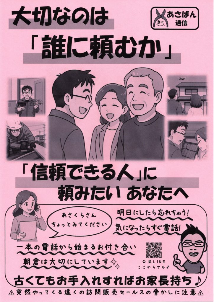あさばんでは、定期的に自社チラシを作成しています。「朝板通信」と名付けています。季節や時期に合わせて、皆様がお困りのこと、お悩みのことに対して重点を起き、様々なサービスを取り上げています。台風や地震対策のためにも、建物の状態がいつもと違うなぁ。と感じたらすぐにご相談してください。