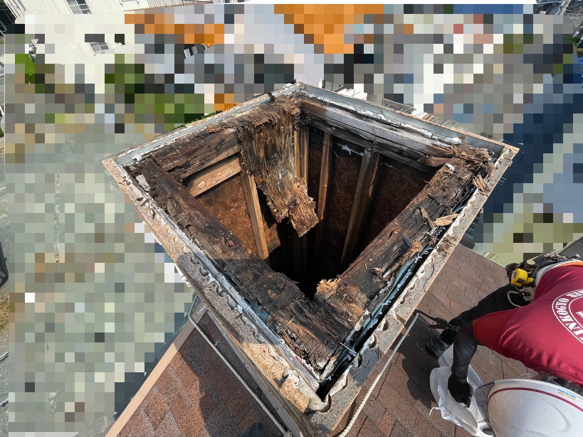 ドローンで調査をすると雨漏りの原因は煙突にありました!煙突の蓋が朽ち果ててしまっていました。